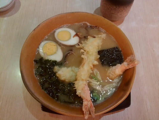 気になる味のほうは、、天ぷらラーメンは凄くうす~いトンコツ?っぽい汁にラーメンの麺というよりもおそばに近い麺が入っている感じがして、「これはラーメンか!?」と思ったのが正直な感想です。